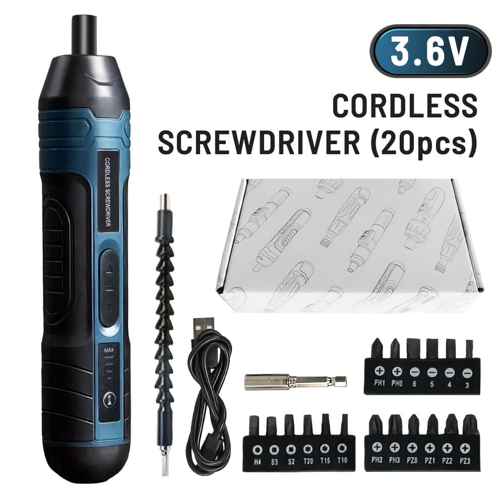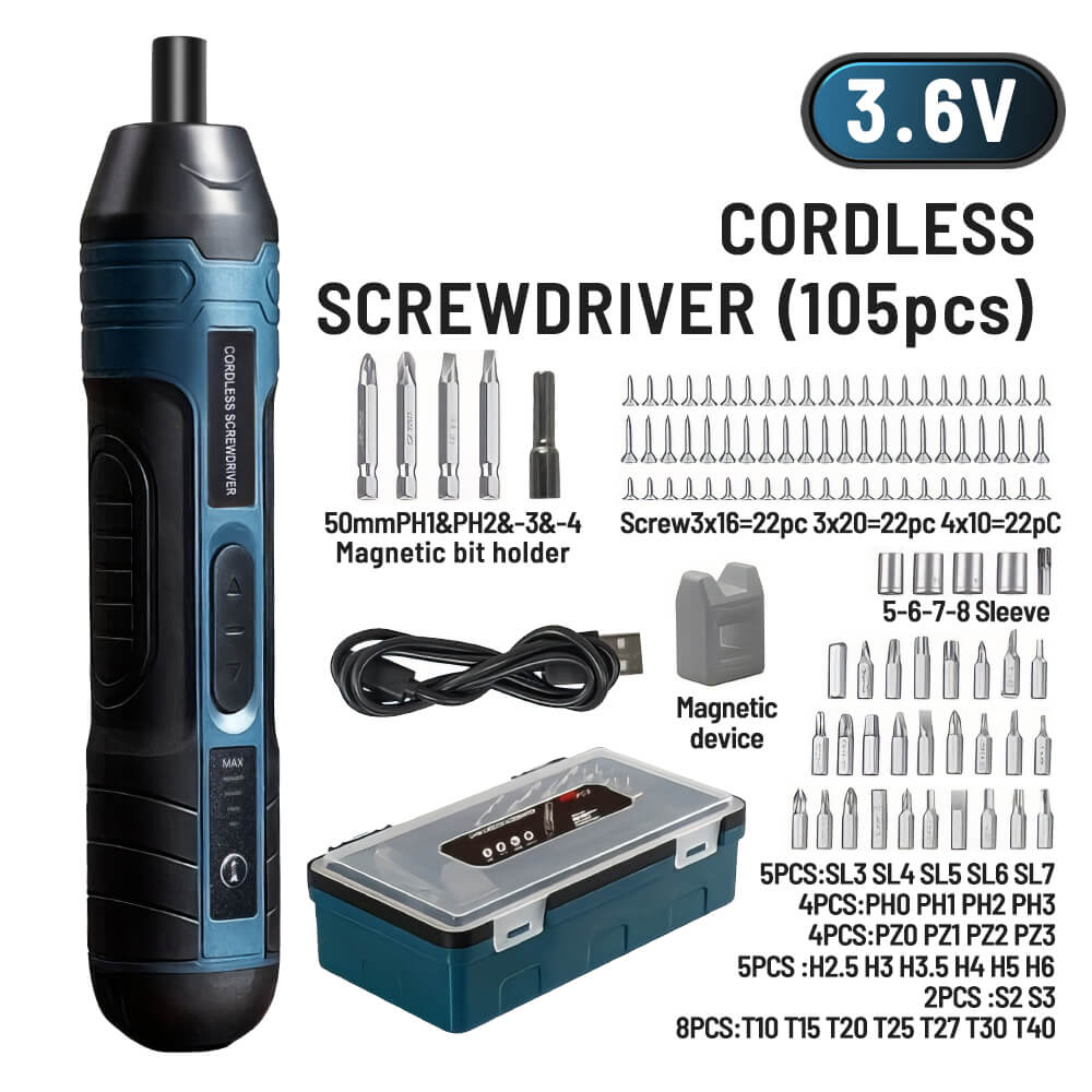 The Electric Screwdriver is a multi-functional tool that comes with 105 attachments including a variety of screwdriver bits, drills, screws and magnetizers. Whether you are assembling furniture or repairing electronics, this comprehensive set of tools allows you to accomplish a variety of tasks effortlessly.Convenient Wireless Design: This rechargeable electric screwdriver comes with a battery that allows it to move freely without the constraints of wires or electrical outlets. Experience the convenience of cordless operation as you work on your projects, and if you don't work for 1 minute, the screwdriver will automatically go into low-power mode.