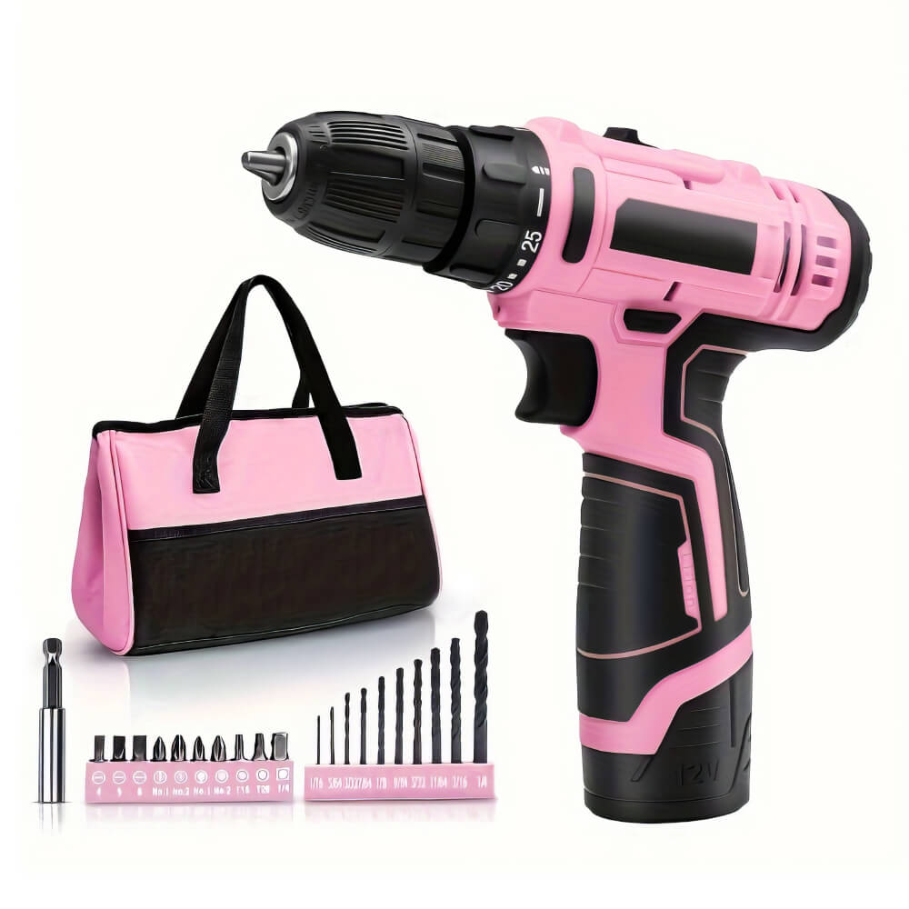 This drill set is the perfect addition to your home tool collection. Compact yet powerful, this cordless power tool features 25+1 Torque settings to allow for precise adjustment for work on different materials. The drill also has settings for Forward and Reverse, and is equipped with a charger, drivers in multiple sizes, and a durable bag for convenient storage; it has everything you need for simple household projects!25+1 Clutch & 2-variable speed: 25+1 position clutch provide precise control for drilling into wood, metal, plastic, and all screw-driving tasks; the 2-speed settings (0-350 rpm and 0-1400rpm), allowing you to choose different speeds to match your desired application.