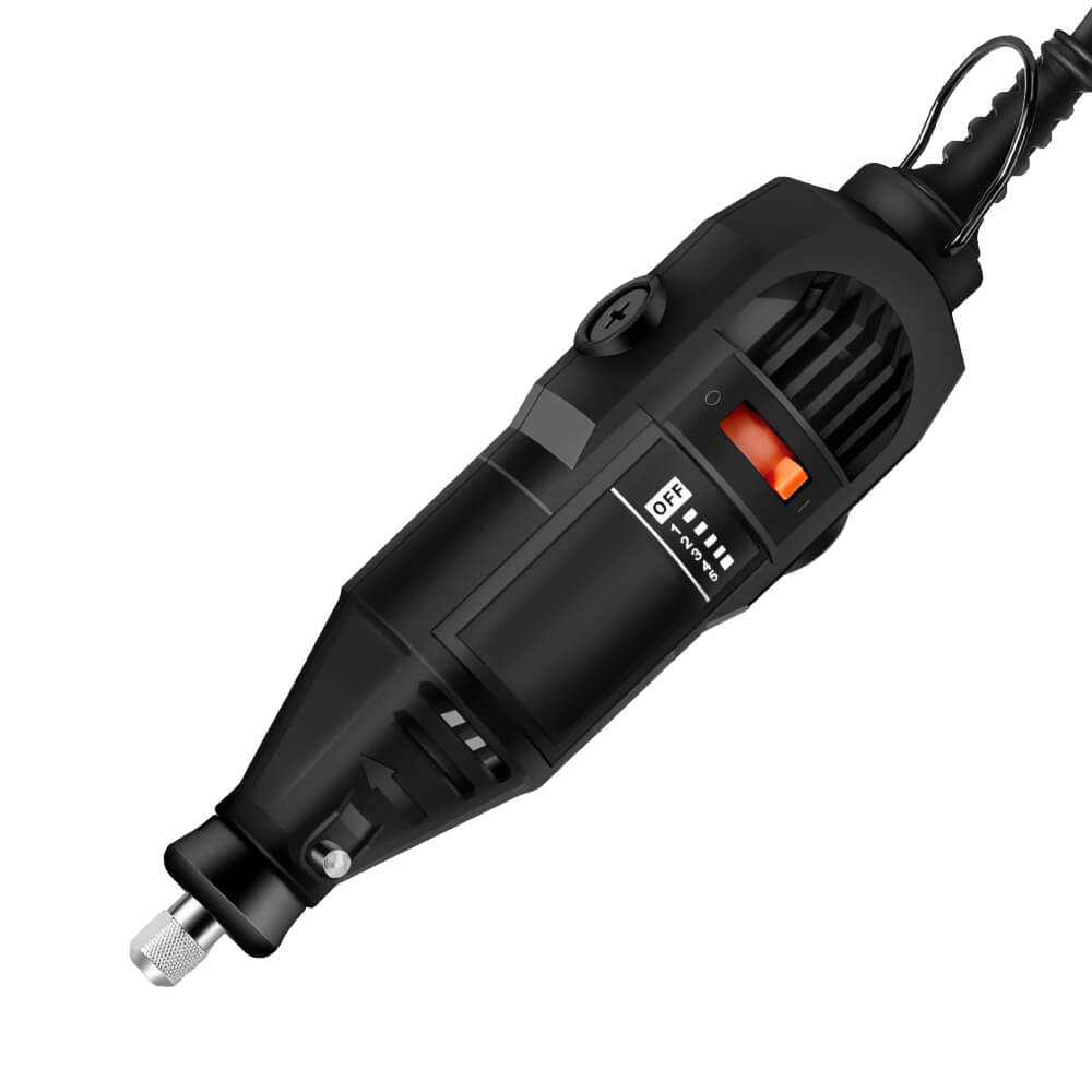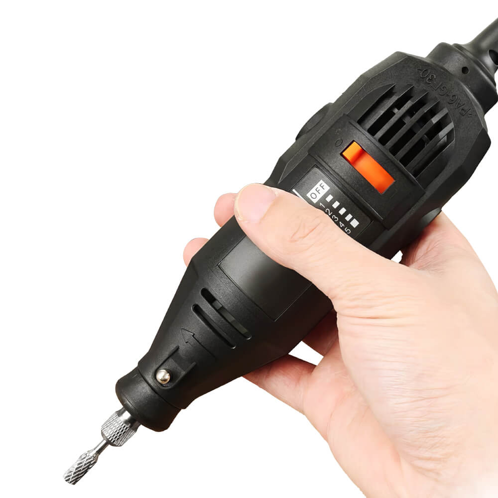 Variable Speed & Compact: Variable speed dial is easy to use. The Variable Speed Adjustment Knob showing 5 Step Speeds from 8,000 to 30,000 RPM. By adjusting the speed you can make delicate engravings on wood, glass, metals, plastics, tile and other materials with control easily.